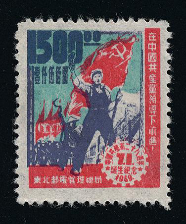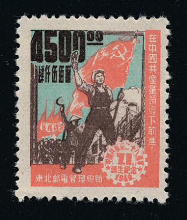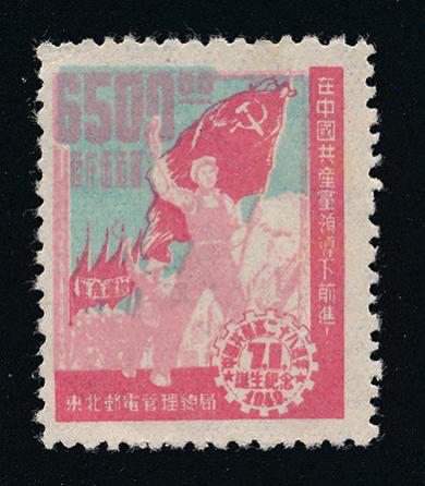 1949年7月1日,東北郵電管理總局發(fā)行《中國(guó)共產(chǎn)黨二十八周年誕生紀(jì)念》郵票,一套3枚。郵票主圖是一位工人高舉中國(guó)共產(chǎn)黨黨旗在行進(jìn),背景為無(wú)數(shù)面紅旗下行進(jìn)的隊(duì)伍,右側(cè)寫(xiě)有一行標(biāo)語(yǔ):“在中國(guó)共產(chǎn)黨領(lǐng)導(dǎo)下前進(jìn)”,右下角的齒輪圖案內(nèi)印有“中國(guó)共產(chǎn)黨二十八周年誕生紀(jì)念·1949”字樣,齒輪中間有大字“7.1”字樣,左上角為大字阿拉伯?dāng)?shù)字面值,其下有一行小字漢字面值。郵票圖案寓意工農(nóng)群眾在黨領(lǐng)導(dǎo)下走向勝利的決心。