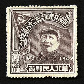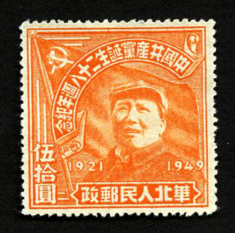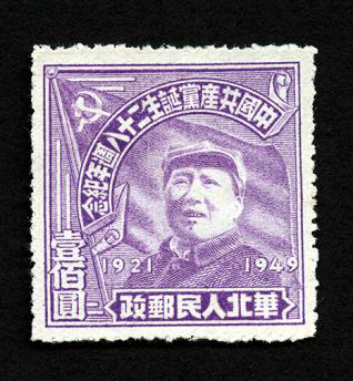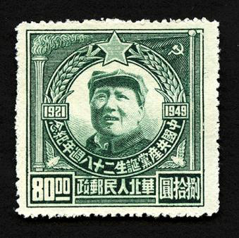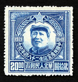 1949年7月1日,旅大郵電管理局發(fā)行《中國(guó)共產(chǎn)黨二十八周年紀(jì)念》郵票,一套1枚。郵票主圖為高高揮動(dòng)左手的毛澤東主席,背后是一面鮮艷的中國(guó)共產(chǎn)黨黨旗;郵票右邊寫(xiě)有“發(fā)展生產(chǎn),改善民生”,左邊寫(xiě)有“發(fā)展文化,培養(yǎng)干部”;畫(huà)面遠(yuǎn)景為工廠的廠房和煙囪。這枚郵票發(fā)行于中華人民共和國(guó)成立前夕,郵票畫(huà)面及文字寓意著即將誕生的新中國(guó)將在毛澤東主席和中國(guó)共產(chǎn)黨的領(lǐng)導(dǎo)下,開(kāi)啟建設(shè)發(fā)展的新篇章。