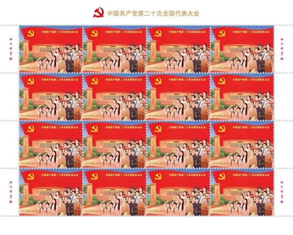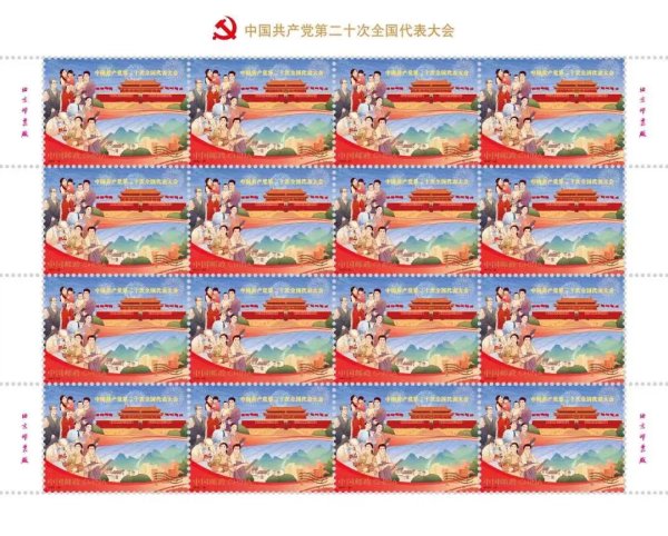 中國郵政定于2022年10月16日發(fā)行《中國共產(chǎn)黨第二十次全國代表大會》紀(jì)念郵票一套2枚,小型張1枚。郵票第一圖名稱為“奮進(jìn)新征程”,第二圖名稱為“建功新時代”,小型張圖案名稱為“慶祝中國共產(chǎn)黨第二十次全國代表大會勝利召開”。全套郵票面值8.40元。郵票計(jì)劃發(fā)行數(shù)量為1390萬套,小型張計(jì)劃發(fā)行數(shù)量790萬枚。