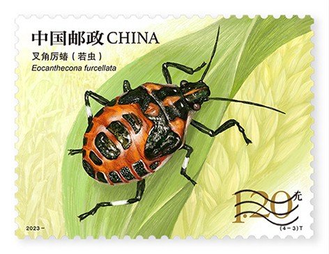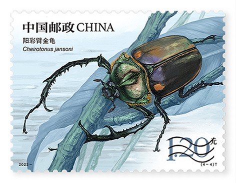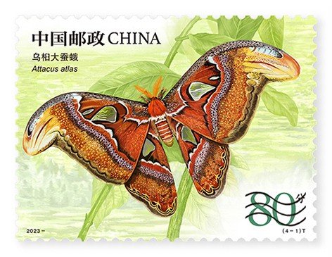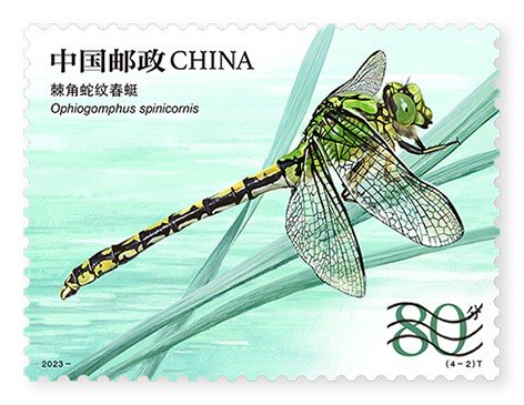 2023年8月23日,《昆蟲(二)》特種郵票發(fā)行。該套郵票一套4枚,郵票圖案名稱為烏桕大蠶蛾、棘角蛇紋春蜓、叉角厲蝽(若蟲)、陽彩臂金龜。