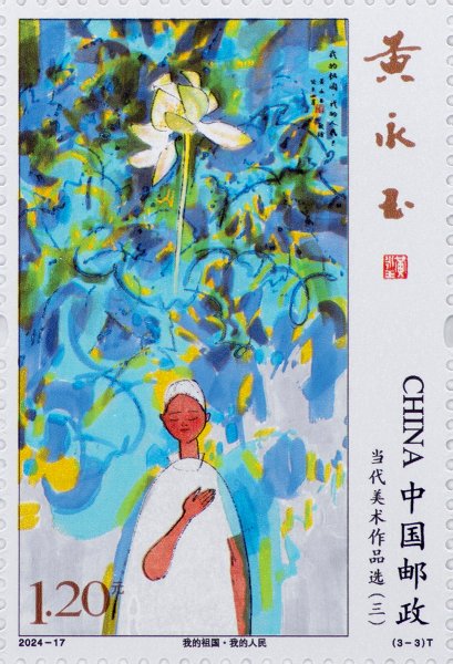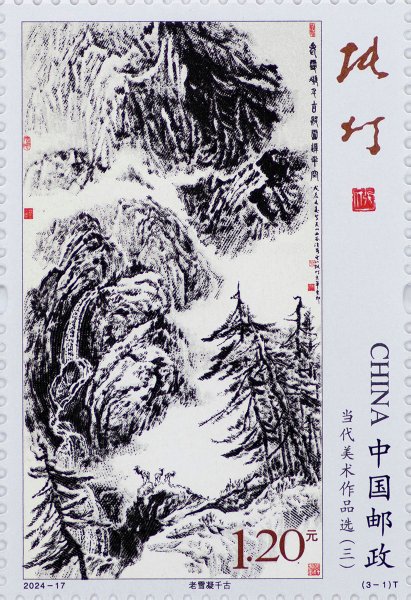 中國(guó)郵政定于2024年8月9日發(fā)行《當(dāng)代美術(shù)作品選(三)》特種郵票1套3枚,郵票圖案名稱為老雪凝千古、白云黃鶴、我的祖國(guó)·我的人民。全套郵票面值3.60元。郵票計(jì)劃發(fā)行數(shù)量為620萬(wàn)套。