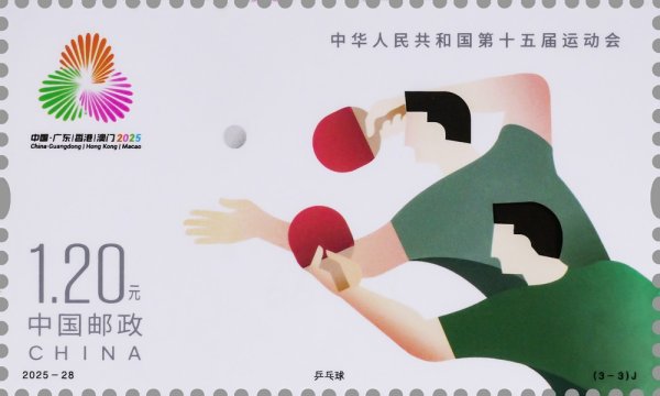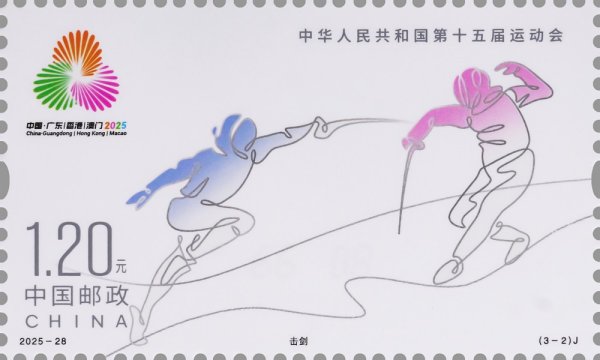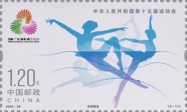 中國郵政定于2025年11月9日發(fā)行《中華人民共和國第十五屆運動會》紀念郵票1套3枚,郵票圖案名稱為:花樣游泳、擊劍、乒乓球。全套郵票面值3.60元,計劃發(fā)行數(shù)量為套票500萬套,版式二69.3萬版。