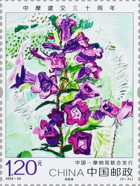 本套郵票分別選用具有兩國民族特色和深厚文化內(nèi)涵的花卉,中國選用栽培歷史悠久的春蘭,摩納哥選用美麗靈動的風鈴草,兩種花卉彰顯出生態(tài)文明的內(nèi)在價值與精神追求。郵票圖案采用油畫表現(xiàn)方式,設計師通過大膽的構圖、恣意的筆觸、靈活的色彩搭配,對具體的物象進行抽象提煉,從而營造出一種生動而富有生命力的畫面效果。兩枚郵票承載著“友誼長存”的深層寓意,希望中摩關系不斷取得新進展,更好造福兩國人民。