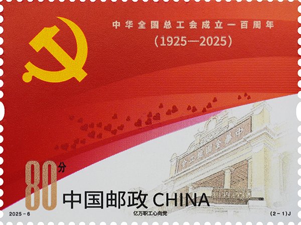中國(guó)郵政定于2025年5月1日發(fā)行《中華全國(guó)總工會(huì)成立一百周年》紀(jì)念郵票1套2枚,郵票圖案名稱為:億萬(wàn)職工心向黨、團(tuán)結(jié)奮斗新征程。全套郵票面值2.00元,計(jì)劃發(fā)行數(shù)量570萬(wàn)套。